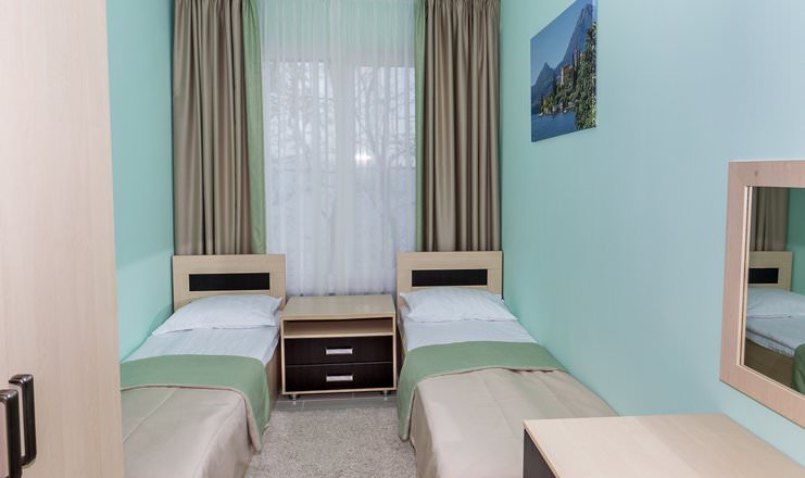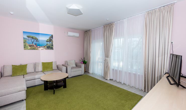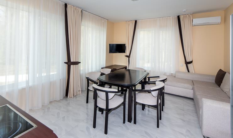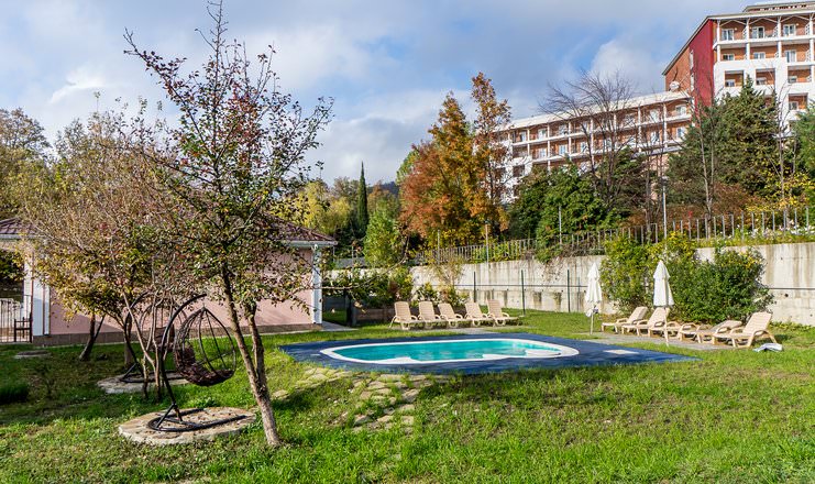 Отдельный коттедж расположен в лесопарковой зоне, оборудован собственным двориком с мангальной зоной, подвесными креслами и мини-бассейном.