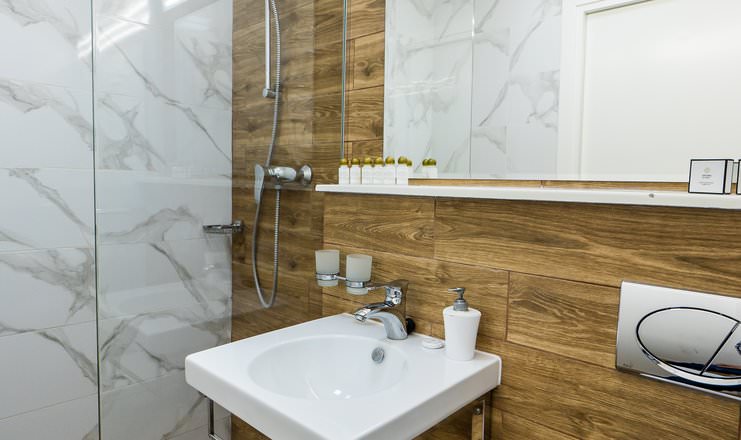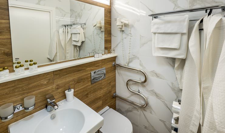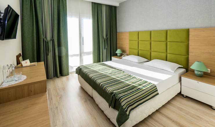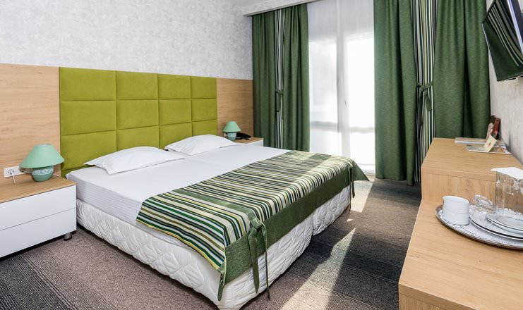 Дизайнерский номер оборудован комфортной большой кроватью, предусмотрено дополнительное размещение гостя 2-13 лет. Есть выход на балкон.